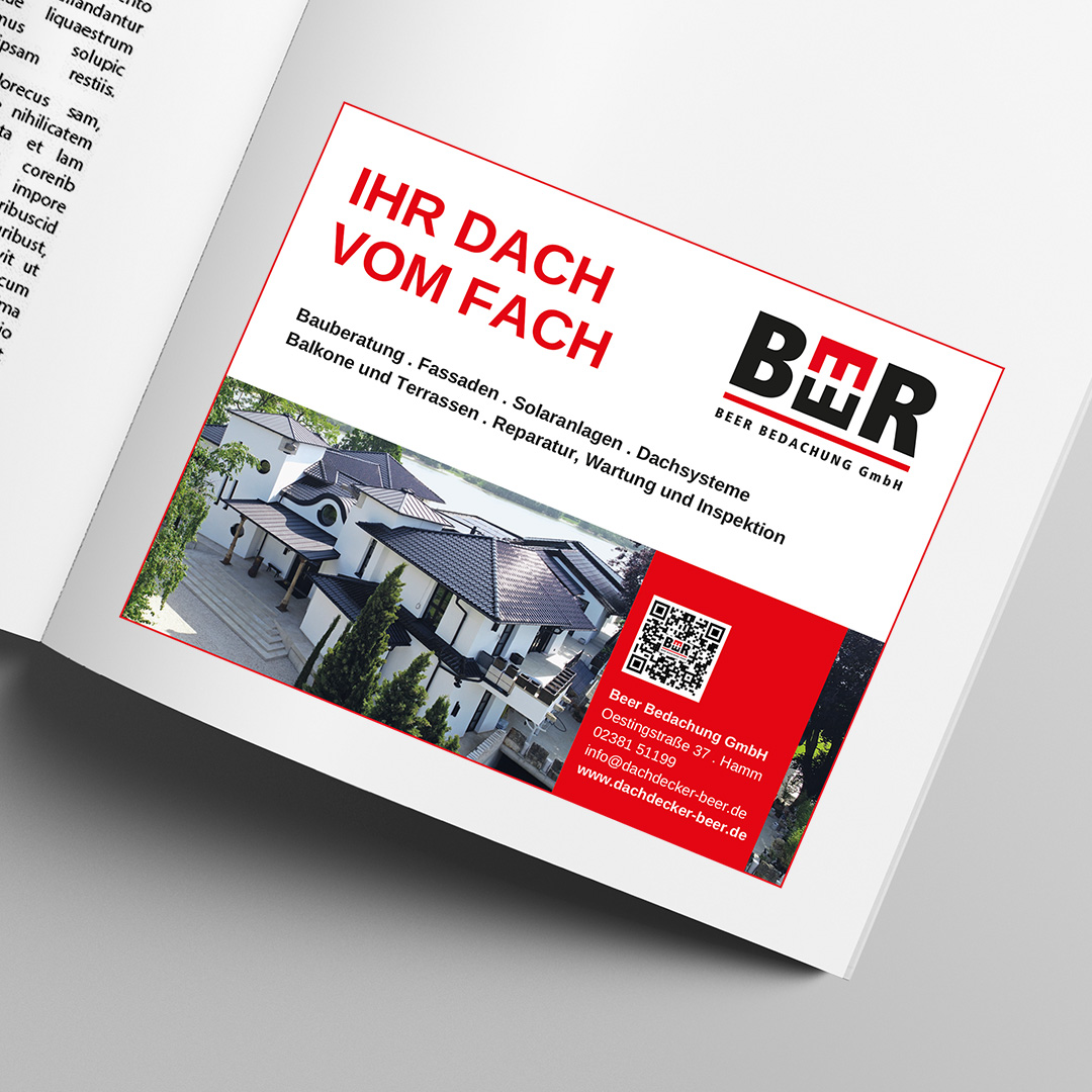 Die Printanzeigen von BEER Bedachung sind in der regionalen Presse und in passenden Magazinen regelmäßig präsent und werden im Umfeld des Betriebs klar wiedererkannt.